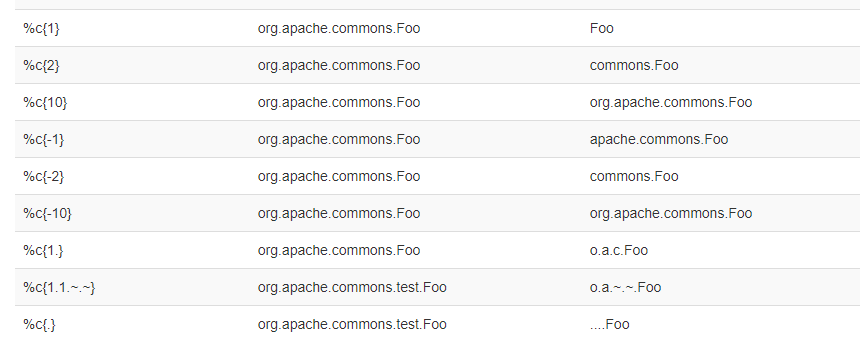 | %c或%logger | 输出logName,如 Logger log = LoggerFactory.getLogger(“com.test.logName”); 则输出为“com.test.logName” ,如果格式为%c{参数},则输出内容参考官网:  |